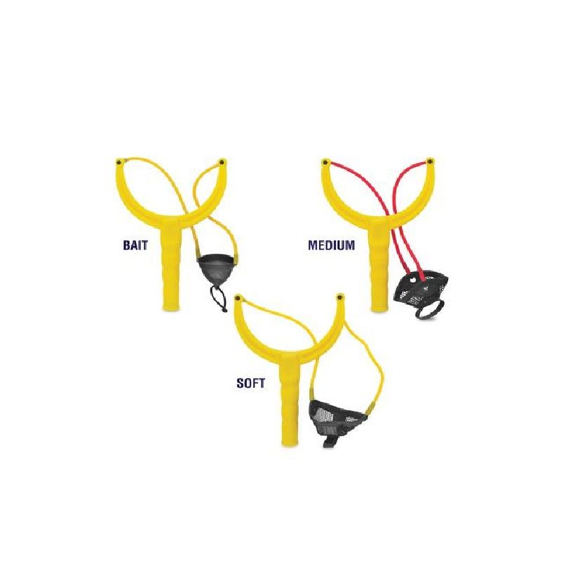 Series of slingshots with very light and easy to handle plastic frame, available in three variants, one for launching loose baits such as pellets, corn and maggots, one for launching groundbait at short distances and one for launching glued groundbait or maggots at short and medium distances.